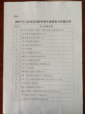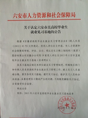 安徽正陽機(jī)械科技有限公司榮獲“2015年六安市直高校畢業(yè)生就業(yè)見習(xí)基地”殊榮